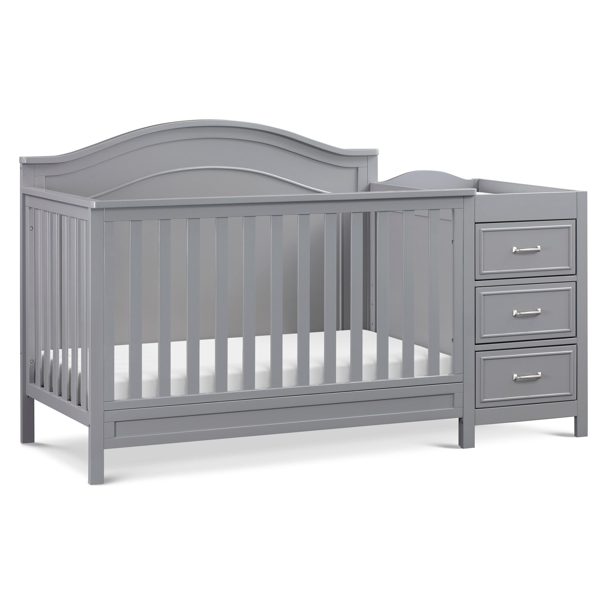 The Charlie Crib is now available in a versatile crib and changer combo that provides everything you need for baby in one convenient package. Charlie 4-in-1 Convertible Crib & Changer features a graceful arched headboard with delicately carved molding and slim feet. During the infant years, the changer with included changing pad, provides an extra deep surface for diaper changes with spacious drawers and multiple storage shelves to hold all of baby's necessities. Beyond the nursery years, this crib converts to a toddler bed, day bed, and full-size bed.