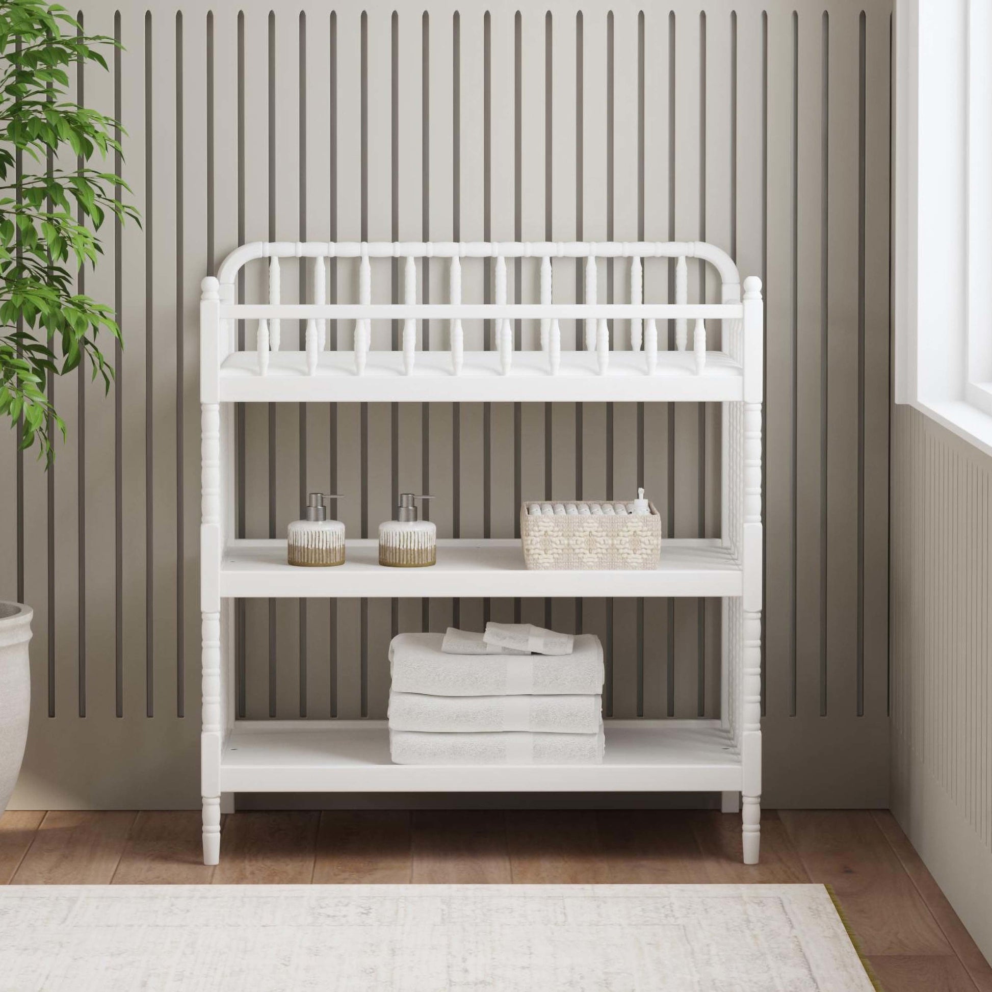 Delight in traditional beauty with DaVinci’s Jenny Lind Changing Table. Intricate spindle posts deliver classic grace from top to toe, for a perfect pairing with the Jenny Lind Crib. Spacious, open shelves keep diapers and lotions within easy reach for convenient changings. Coordinates with the Jenny Lind 3-in-1 Convertible Crib.